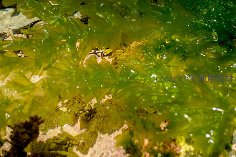 浓密绿藻覆盖岩面,水膜折射出梦幻光斑