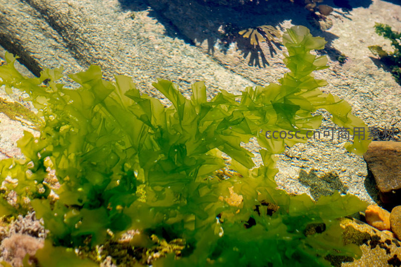 清澈浅水中,宽叶绿藻从石缝间伸展而出,叶缘自然卷曲,受水流轻抚微微摆动;阳光斜射投下清晰影子,展现潮间带生物顽强而优美的生存状态。