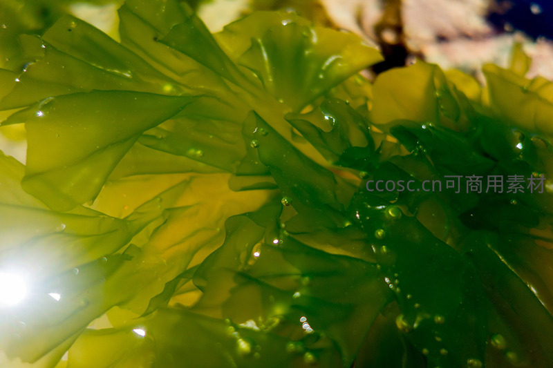 高清微距镜头下,海藻叶片层叠舒展,表面附着透明水珠,在阳光折射下闪烁晶莹光芒;翠绿与黄绿交织的色调呈现生命活力,背景虚化突出主体细节,展现海洋生态微观之美。