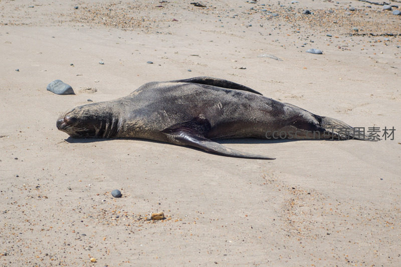 沙滩上搁浅海狮静卧休憩,灰黑皮毛覆沙粒,姿态安详自然