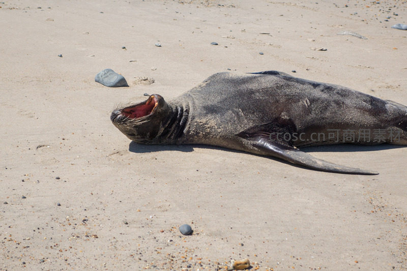 海狮仰头张口,露出鲜红口腔与密集触须,唾液微光闪烁;沙粒粘附于颈部褶皱,阳光强化其皮肤质感与动态表情,精准捕捉海洋哺乳动物日常行为中的鲜活瞬间。