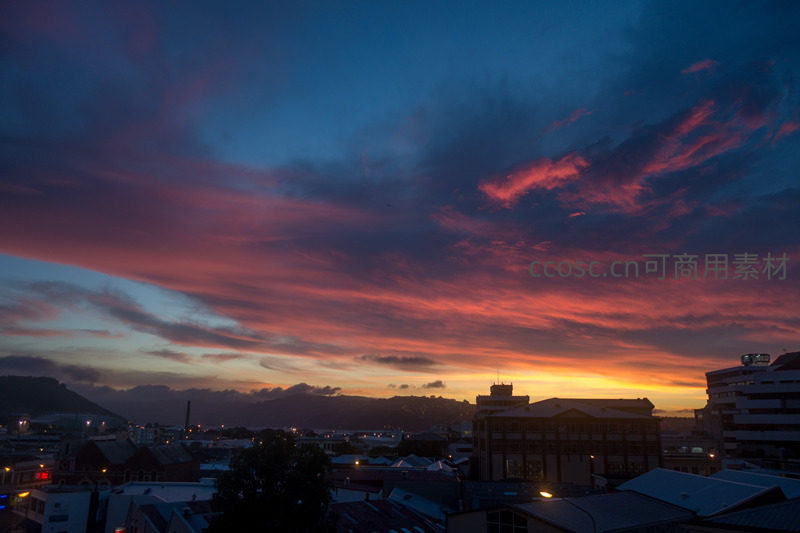 城市黄昏天际线,彩霞漫卷映衬建筑剪影