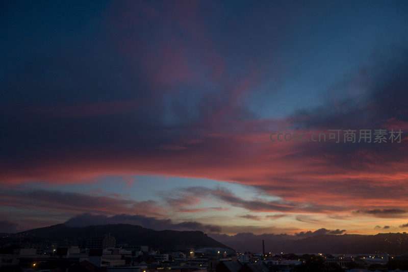 低角度仰拍视角下,厚重云层被落日染成粉紫与深红渐变,城市屋顶与远山形成深色剪影带,微光点缀街灯初亮,营造出静谧而富有戏剧张力的黄昏氛围。