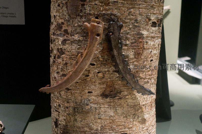 展柜中两件毛利人传统木牙饰件(Matau或Hei Matau变体)附着于仿树皮基座,一为浅褐木质,一为深色染处理,边缘锯齿状,孔洞用于穿系,兼具实用、装饰与精神护佑功能。
