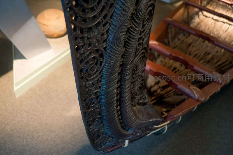 新西兰毛利族传统独木舟(waka)船首雕刻特写,深色木材上布满象征祖先与自然的螺旋纹(koru)与图腾形象,工艺精湛,体现深厚部落信仰与航海传统,陈列于博物馆展柜中。
