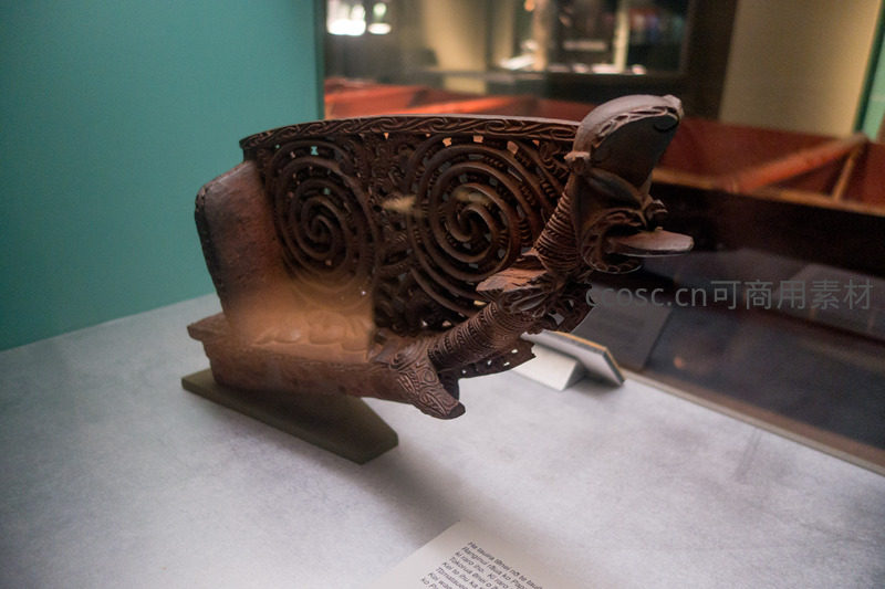 一件独立展出的毛利独木舟船尾装饰构件,雕刻为神话中的神兽(如Taniwha),头部昂扬,口衔螺旋纹饰,背部刻满kowhaiwhai图案;木材呈深红褐色,工艺繁复,用于仪式性航行与部落威望展示。