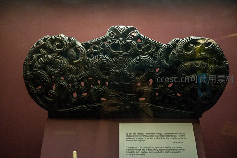 这件深色木质头饰为新西兰毛利族传统仪式用品,表面布满标志性的科罗(koru)涡旋纹与人脸图腾,象征生命循环、祖先传承与精神守护;雕刻精细镂空,体现高超手工技艺,现陈列于博物馆展柜中,背景说明牌含毛利语与英语双语解说。