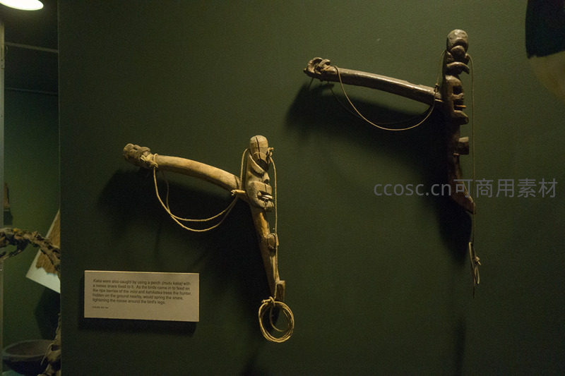 展墙上悬挂两件毛利族传统捕鸟器‘卡卡’(Kaka),以动物骨骼与木料制成,配麻绳滑轮结构,用于诱捕珍稀鸟类如卡卡鹦鹉;器物头部刻有人面纹饰,兼具实用与仪式功能,反映原住民对生态的深刻理解与可持续利用智慧。