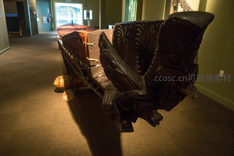 博物馆内毛利独木舟(瓦卡)陈列,雕饰繁复庄重,象征部落精神