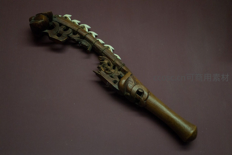 毛利战斧Patu装饰性木雕长柄,嵌骨片与卷曲纹样工艺精湛