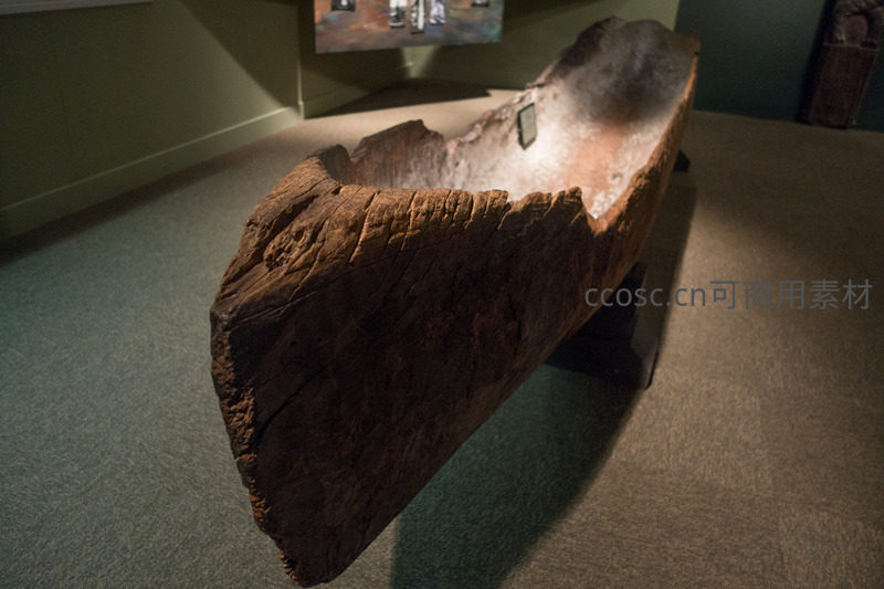 独木舟Waka原木剖面展示,粗犷树皮纹理与手工凿痕见证古老造船术