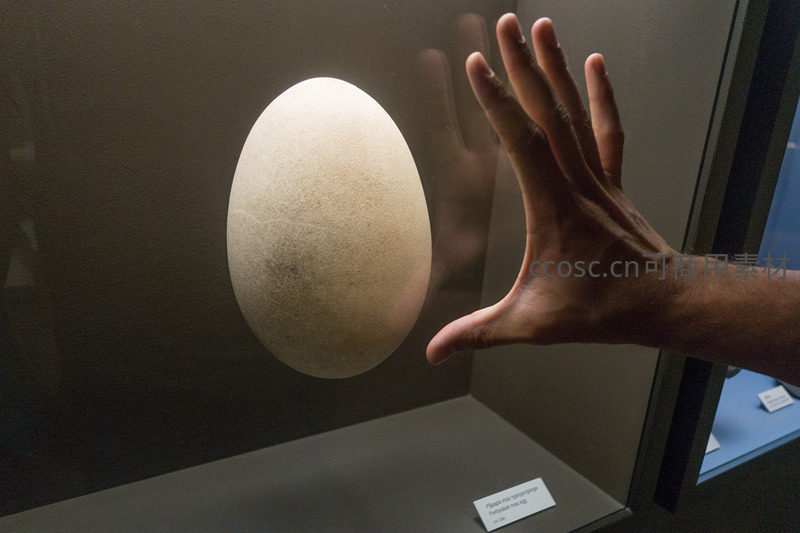 巨型鸟蛋陈列于玻璃展柜中,游客伸手比对尺寸,突显其罕见硕大特征