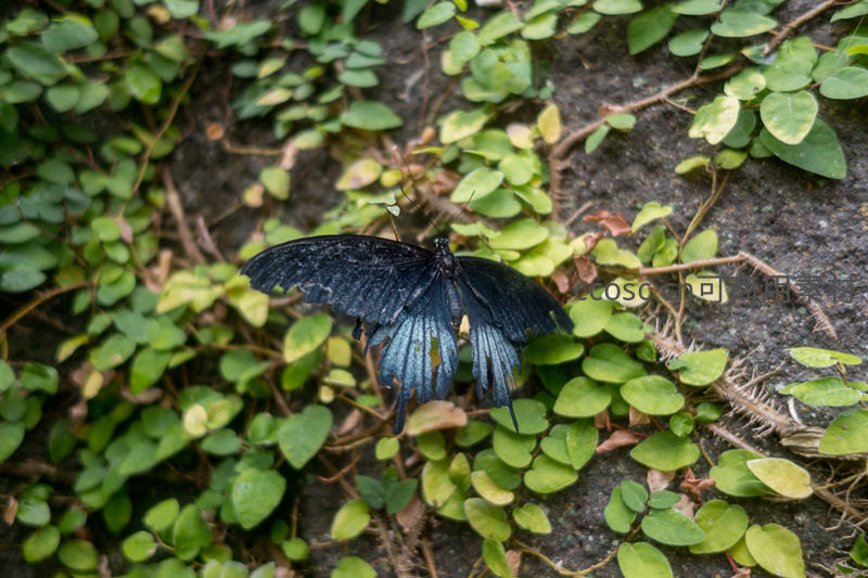 蓝凤蝶栖息于青翠藤蔓间,翅膀泛着金属光泽