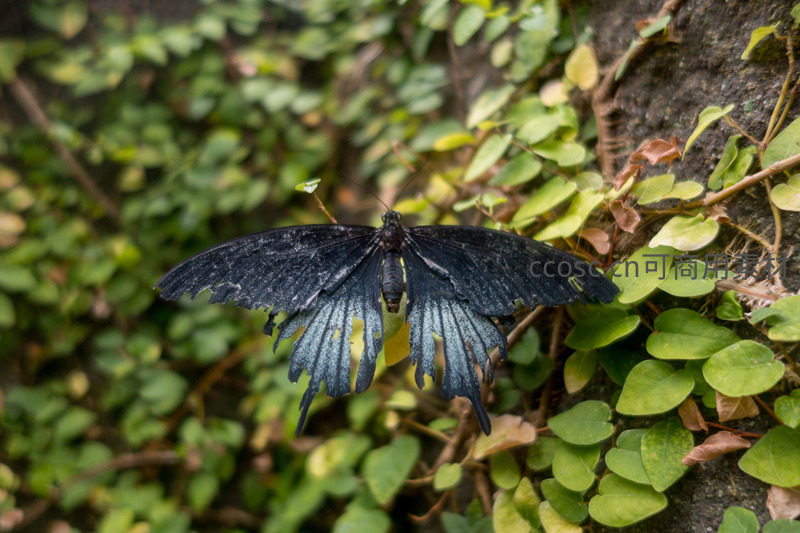 黑蓝凤蝶停驻岩壁绿植,翅缘残缺显自然痕迹