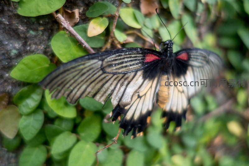 黑底红斑凤蝶栖息绿叶间,翅膀舒展显优雅姿态