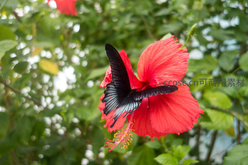 纯黑燕尾蝶停驻艳红扶桑花,吸蜜姿态生动自然