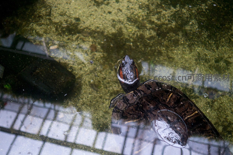 一只红耳龟头部浮出浅水,标志性红色耳斑鲜明,湿润甲壳反光,水面映出瓷砖底纹与龟影,水质略带藻绿,体现城市生态池塘中常见龟类的日常姿态与环境互动。