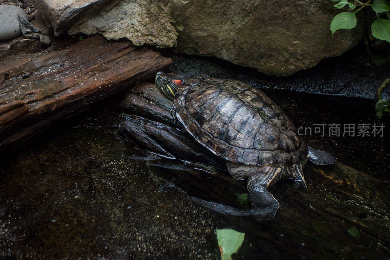红耳龟伏于浸水朽木之上,背甲纹理清晰,颈部红斑醒目,周围青苔覆石、水流潺潺,低角度拍摄强化其栖息环境的野趣与湿润质感,展现淡水龟类典型栖息行为。