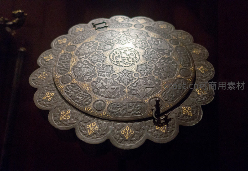 伊斯兰风格银质雕花圆盘,繁复几何与植物纹饰镶嵌金线