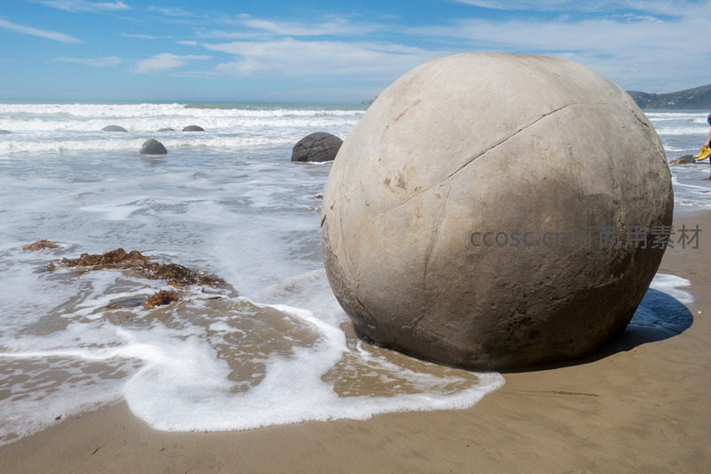 多颗摩拉基巨石散落海岸,潮汐退去留下湿润沙地与海藻痕迹