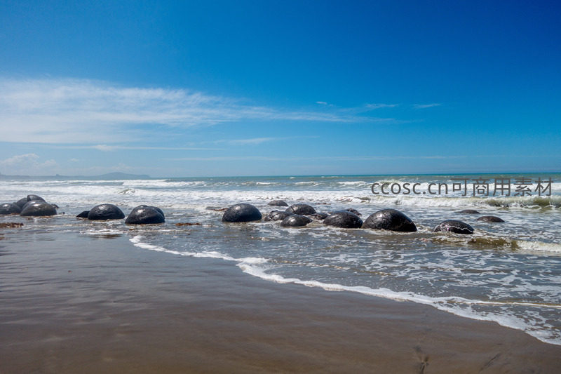 新西兰摩拉基巨石滩阳光下的海浪轻抚奇石