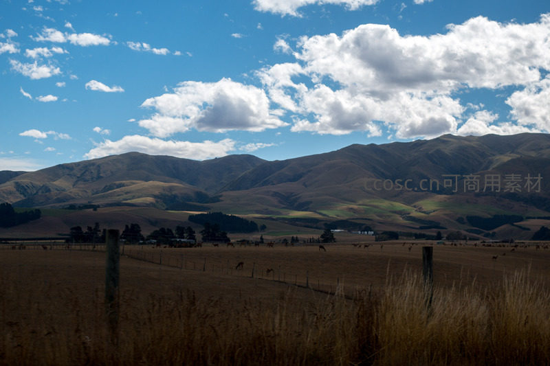 在连绵起伏的南岛山麓下,成群牛羊悠闲散布于枯黄与青绿交织的广阔草场;前景高草随风轻摆,中景铁丝围栏划分田界,背景山体层次丰富,白云投下移动阴影,构成一幅和谐、宁静而富有生命力的现代田园牧歌图景。