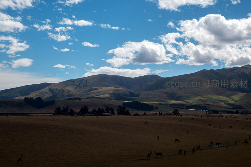广袤金黄草地上散布着数十只野生鹿群,低头觅食或缓步踱行;背景是连绵起伏的褐色山峦,山腰点缀绿意与林带,上方湛蓝天空飘浮蓬松积云,光影层次分明,展现南半球牧场生态之美。