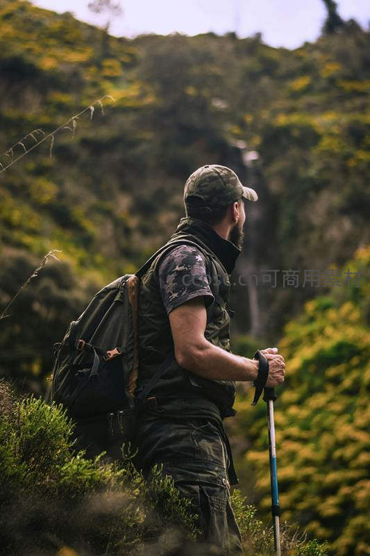 徒步者驻足山径回望,背包手杖相伴绿谷幽深景致