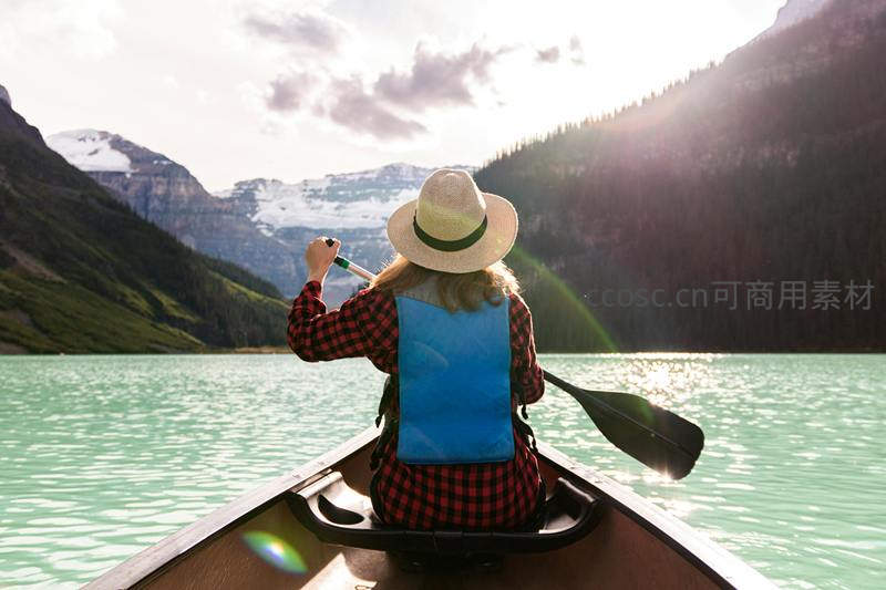 独舟划过翡翠湖面,雪山倒影中女子悠然桨行