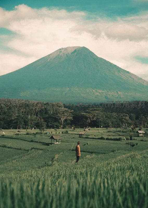 一位身着棕色外套的男子背对镜头站立于青翠稻田中,前方是规整的水田与几座茅草顶小亭,远处雄伟火山轮廓清晰,天空云层柔和,整体画面呈现宁静悠远的东南亚乡村诗意景象。