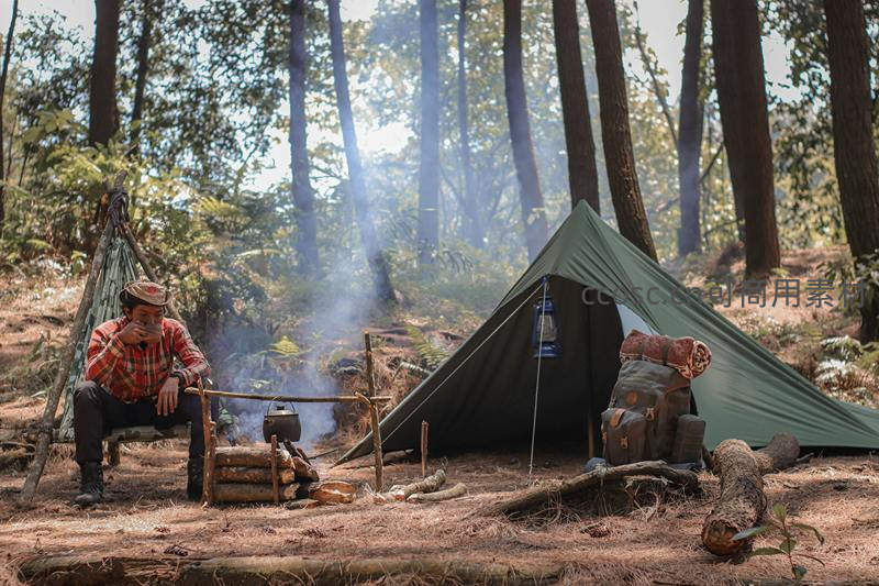 林间营地炊烟袅袅,男子围炉品茶,绿帐与吊床营造静谧野营氛围
