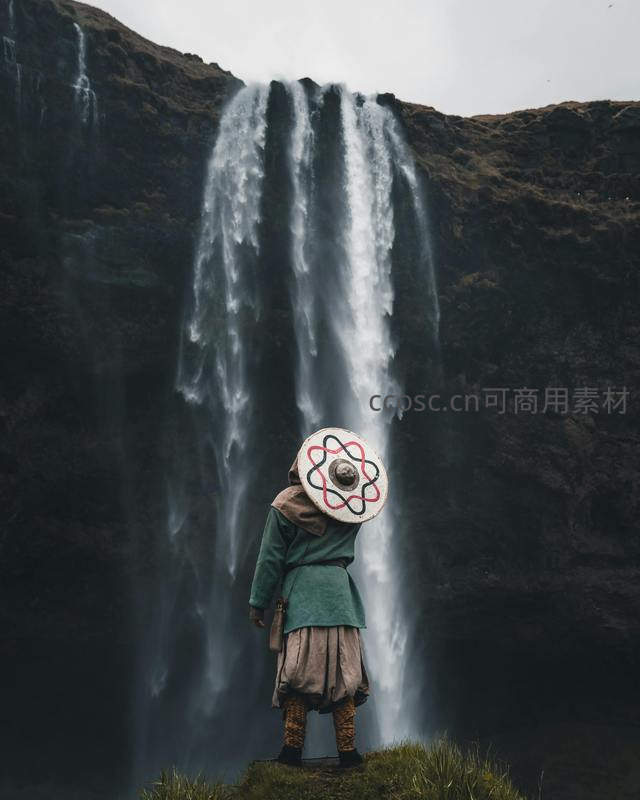 维京战士静立塞里雅兰瀑布前凝望苍穹