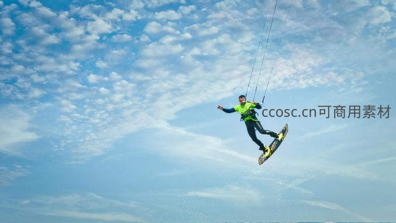 风筝冲浪者腾空跃起,蓝天白云下展现极限运动的自由与力量