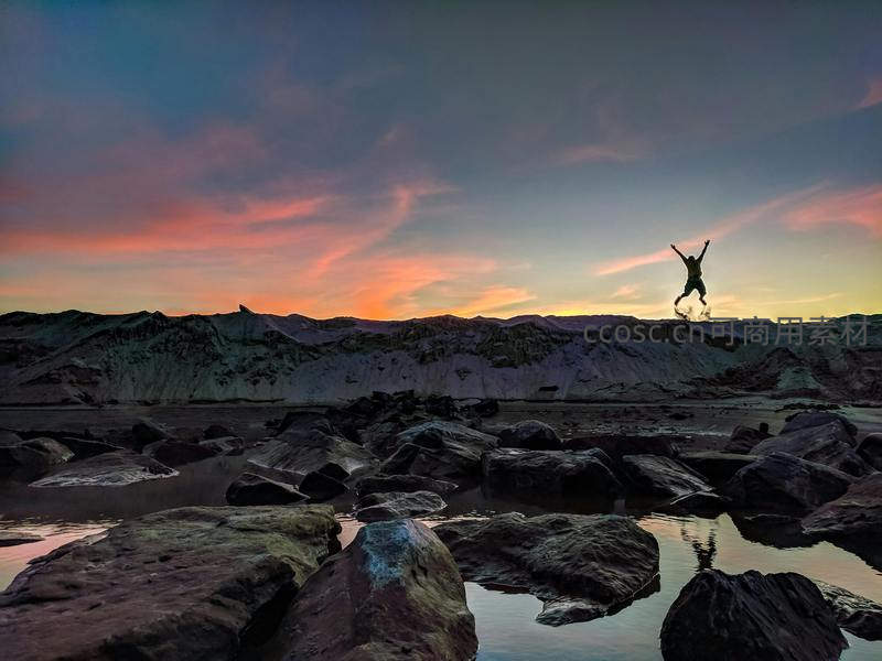 暮色滩涂上纵身一跃,剪影人物在彩霞与岩礁间定格自由瞬间