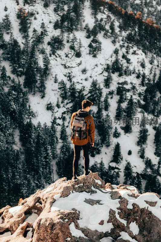 背包客立于雪覆岩顶远眺林海,冬日高山静谧时刻