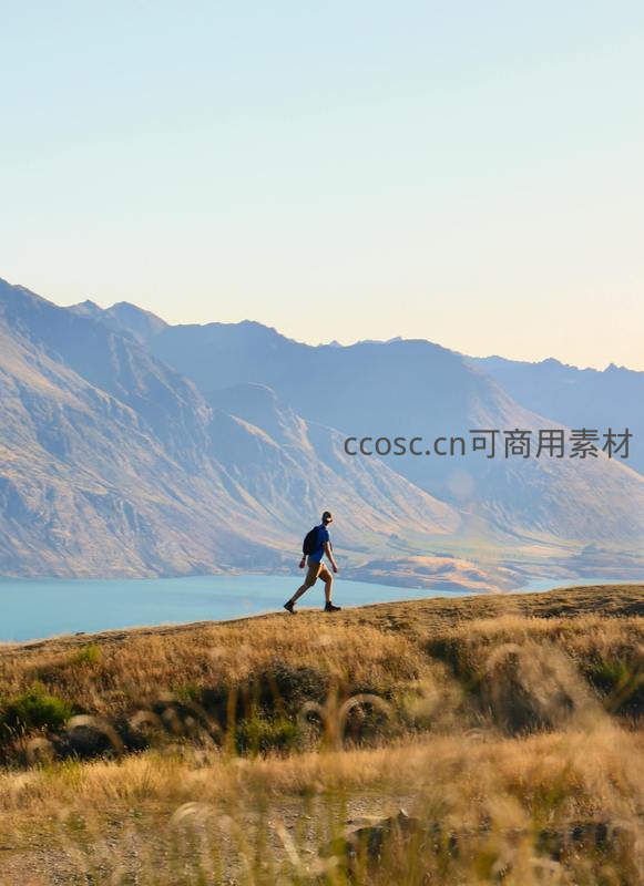 一人身着蓝衣背负小包,在干燥草坡山脊上悠然行走,脚下是辽阔湛蓝湖泊,背景层叠山脉在柔光下呈现淡青灰调,前景虚化草穗增添景深,传递自由与沉思的旅人情怀。