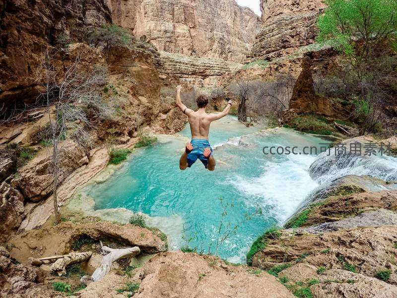 在壮丽峡谷间,一名男子腾空跃向清澈碧绿的水潭,水花四溅;背景是层层叠叠的红褐色岩壁与稀疏植被,阳光洒落水面波光粼粼,尽显野性与自由的生命力。