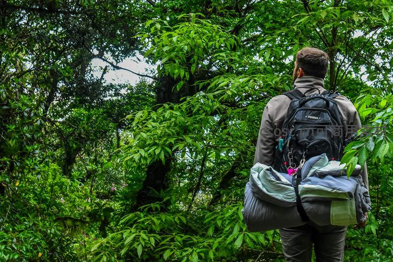男子背对镜头,肩背黑色登山包并捆扎睡袋,置身茂密亚热带森林中;阳光透过叶隙洒落,新绿叶片层次丰富,营造出静谧而充满探索欲的远足启程氛围。