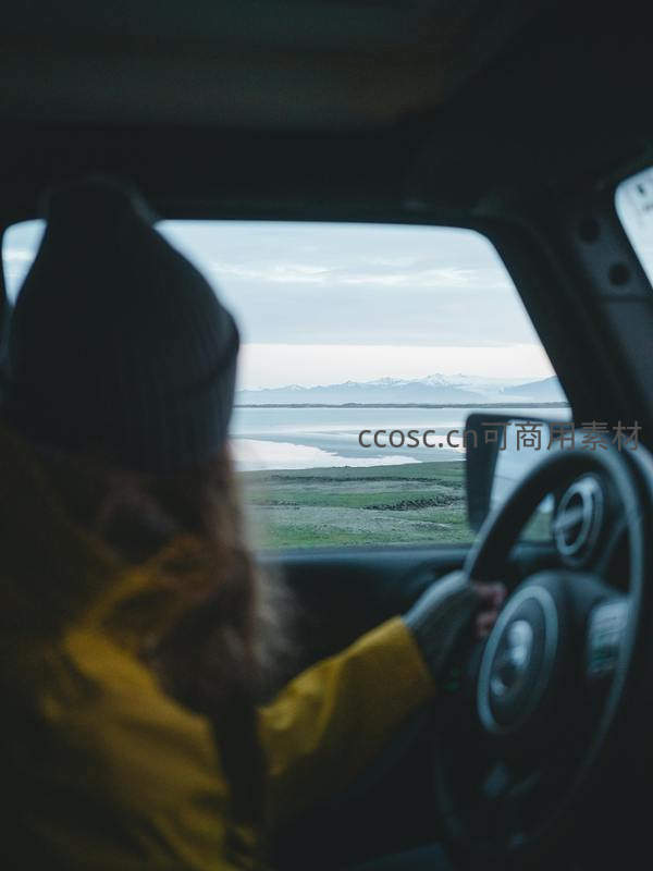 从车内后座视角捕捉一位戴针织帽、穿亮黄外套的驾驶者侧影,手握方向盘,目光投向车窗外辽阔湿地、浅滩与远处覆雪山脉;阴云低垂下透出柔光,传递静谧旅途中的沉思与自由向往。