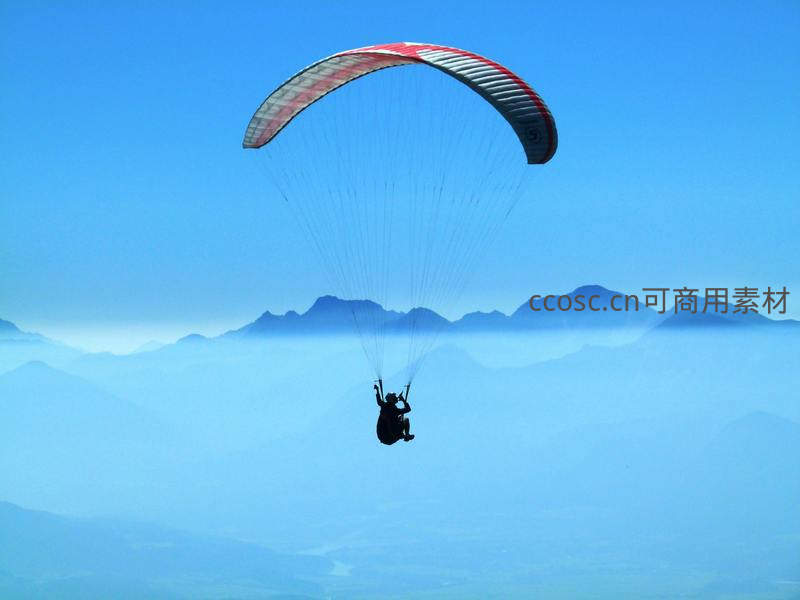 红白相间的滑翔伞在澄澈蓝天下舒展飞行,伞下飞行员剪影清晰,下方连绵山脉被薄雾轻笼,层次分明,远山如黛,构成一幅人与自然和谐共舞的高空壮丽画卷。