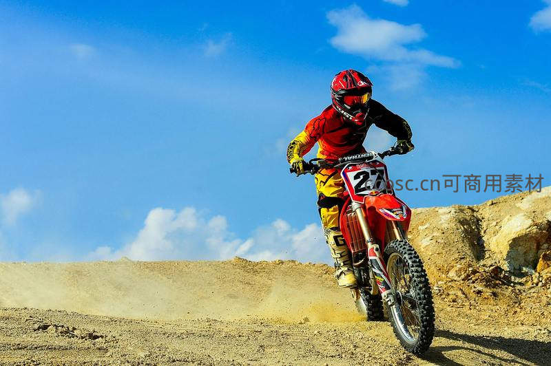 一名全副武装的越野摩托车手驾驶红色27号赛车,在干燥土坡上高速过弯,车轮卷起黄沙;其红黄配色骑行服与头盔在澄澈蓝天白云下格外醒目,动感十足,彰显极限运动的速度与激情。