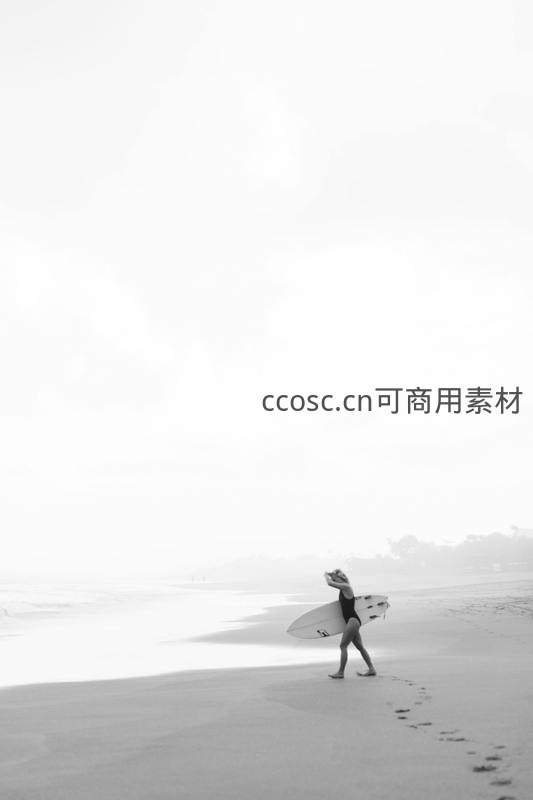 黑白影像中冲浪者携板独行海岸线