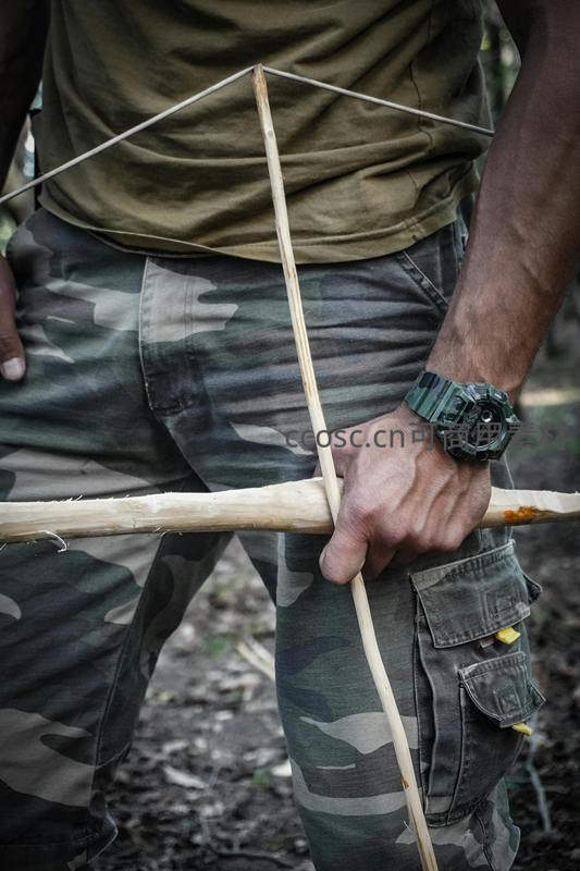 一名身穿迷彩服的男子在林间手持自制木弓,手腕佩戴军绿色运动手表,专注调整弓弦,展现原始技能与现代装备结合的野外求生场景。