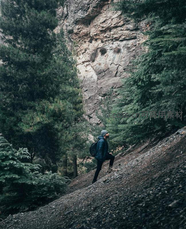 一名戴灰帽、背黑色背包的徒步者停步于碎石斜坡上,凝望高耸岩壁与两侧茂密针叶林构成的幽闭通道;光线柔和穿透林隙,营造出原始、静谧又略带神秘的野外探索氛围。