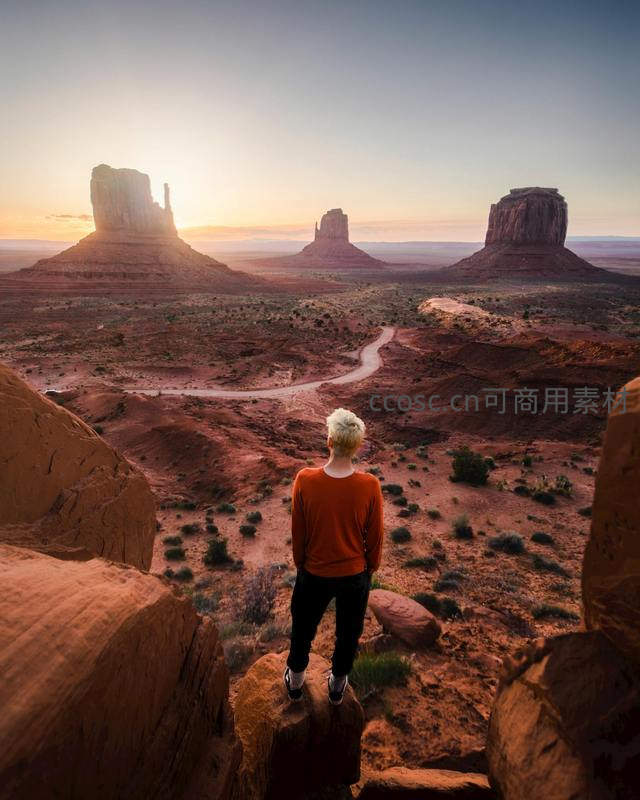 一位穿橙色上衣的游客站在岩石凸起处,背对镜头俯瞰广袤荒漠,远处三座标志性砂岩孤峰在夕照中泛着暖光,蜿蜒土路穿行其间,植被稀疏点缀,整体氛围宁静辽远,象征探索与沉思。