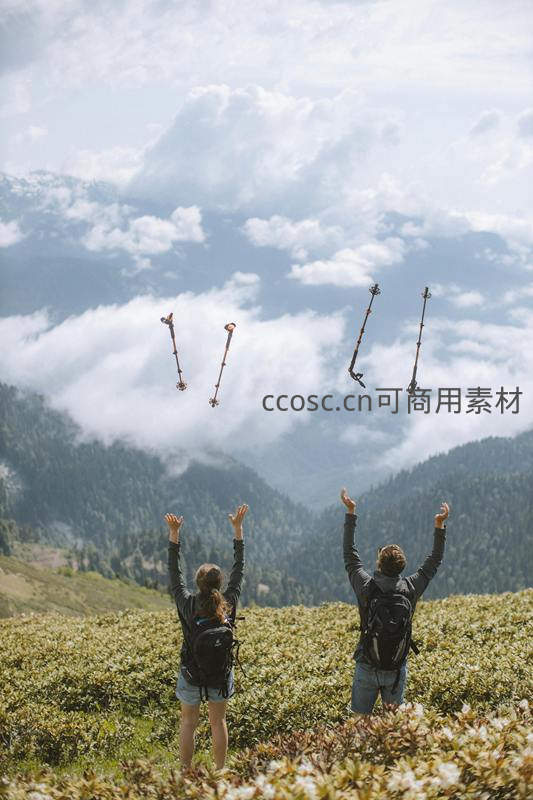 徒步情侣在高山草甸抛掷登山杖,云海翻腾映衬欢愉瞬间