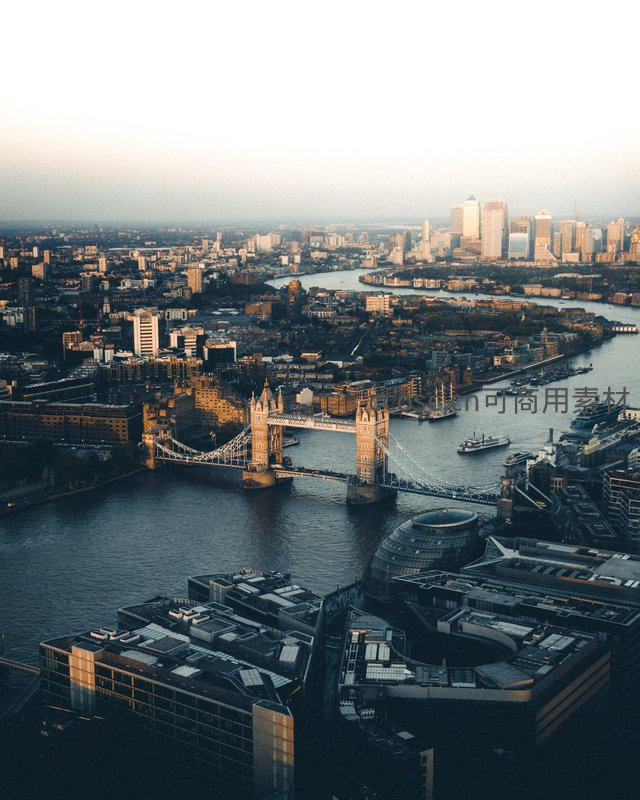 伦敦塔桥与金融城日落航拍,泰晤士河穿城而过