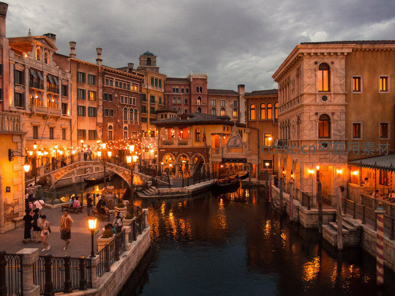 威尼斯风情街景夜色,暖光映照水巷与拱桥游人如织
