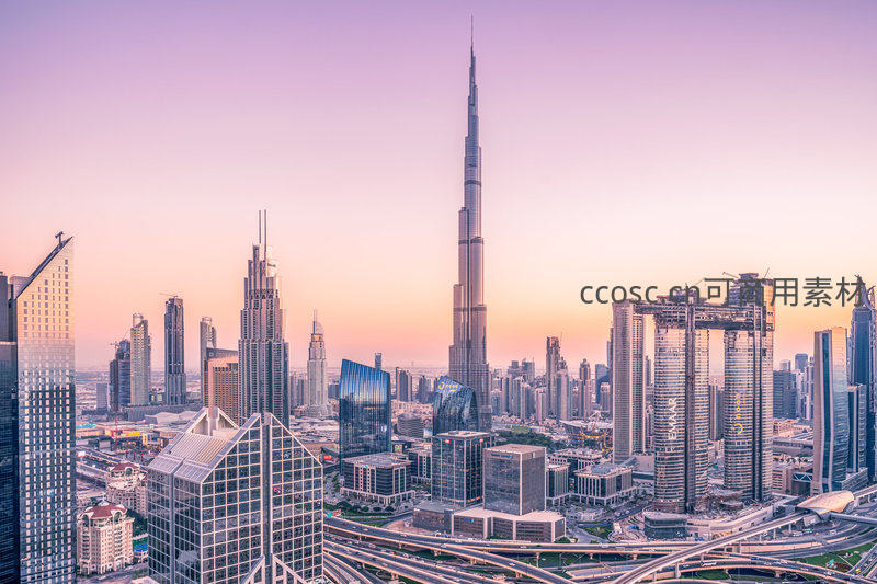 暮色中迪拜金融中心全景航拍,世界最高建筑哈利法塔傲然矗立,周边玻璃幕墙高楼林立;交错高架路网如银蛇盘绕,粉紫渐变天空映衬下,彰显中东超现代都市的磅礴气魄与工程奇迹。