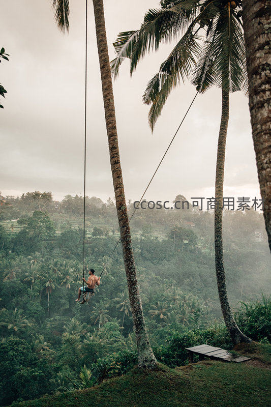 巴厘岛丛林秋千悬于椰林之上,男子悠荡俯瞰梯田云海,冒险与宁静并存